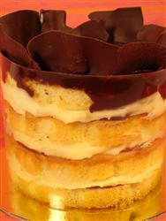 Today, I finally got around to doing just that at the Omni Parker House hotel, which is credited with actually creating the “pie” back in the 19th century. The dessert is actually a vanilla sponge cake cut in two layers with a vanilla custard between and some sort of chocolate glaze over top. Apparently there are endless variations. The one I had today included almond shavings, whipped cream, and strawberries, and looked more like this version (right) than the one above. Unfortunately, I neglected to take my camera, so don’t have a genuine “Anna’s Boston Cream Pie” visual.