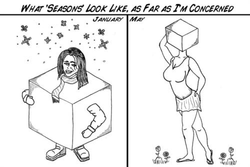 The take-away message of this cartoon about straight guys is that they are incapable of (and uninterested in) seeing the people to whom they are attracted sexually as whole persons. If a woman is bundled up in winter clothes, their bodies might as well not exist; if a woman is dressed in form-fitting, skin-baring clothes, then their head (read: personhood) disappears from view. This is a trope of male sexuality so prevalent that a lot of women have bought into this narrative of how men’s sexuality works, as evidenced by the calls for a “return to modesty” by a number of prominent women writers and activists [4]. In this view, dudes are incapable of integrating their physical, sexual desire for others into an understanding of other human beings as more than a useful means to the end of sexual gratification. I call bullshit. I call bullshit on the idea that men are incapable of caring about the women they are attracted to as whole persons: as incredibly sexy, active, physical presences and as human beings with thoughts, feelings, and distinct personalities. Regardless of the time of year, and regardless of what said object of desire is wearing at the moment she happens to cross their flightpath.