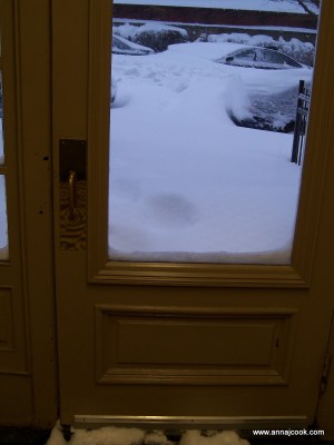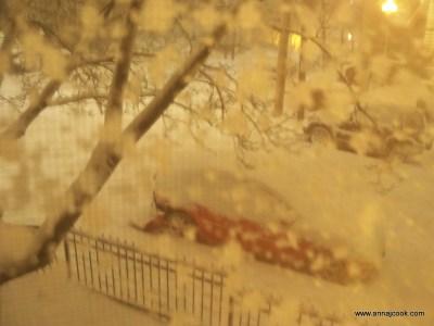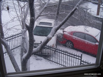 By the time we went to bed around 9pm, this was the view out that same window (note the red car, sans bumper, now half buried in snow).