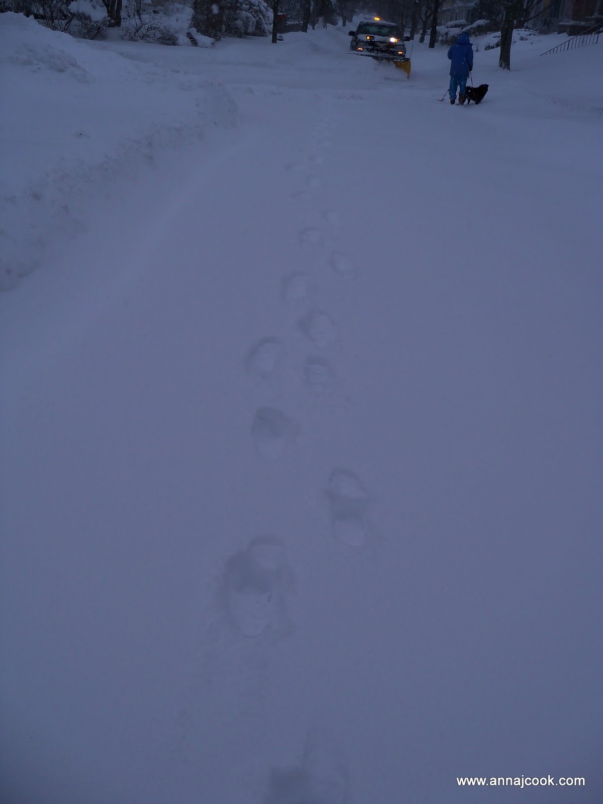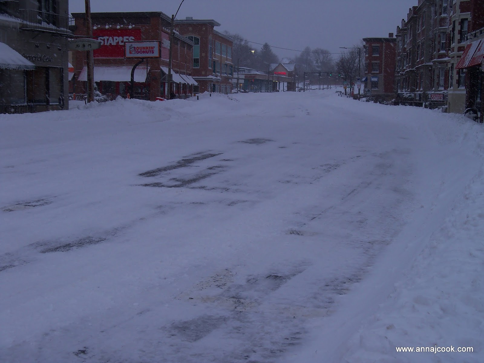 You can see I was perhaps the second person to leave the building on foot this morning; with the snow still falling and blowing, and a travel ban in effect state-wide, few people are bothering to dig out.