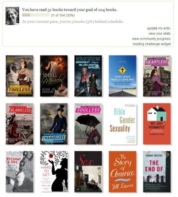 It’s May 1st today, which means we’re 1/3 of the way through 2013, and I should be 1/3 of the way through my reading goal of 104 books ….. oooh, not so much. According to GoodReads, I’m three books behind.