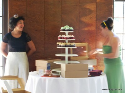 The wedding “cake” was actually a tower of cupcakes catered by James and the Giant Cupcake, brought in and arranged by these to enthusiastic women (one of whom was wearing a cupcake on her head!).