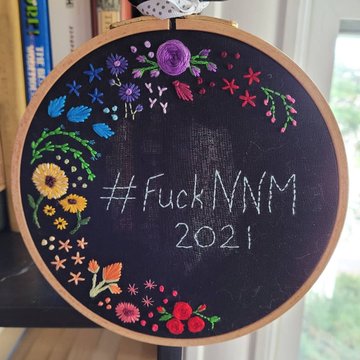 Embroidery featuring rainbow flowers and the hashtag #FuckNNM2021. Made by a friend.