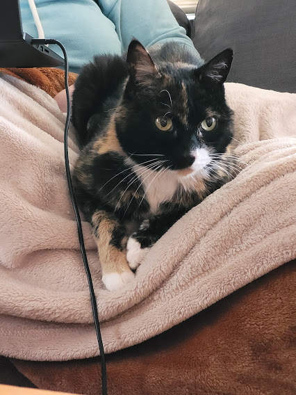 Teazle, our tortie cat, tucked in under a blue fleece blanket