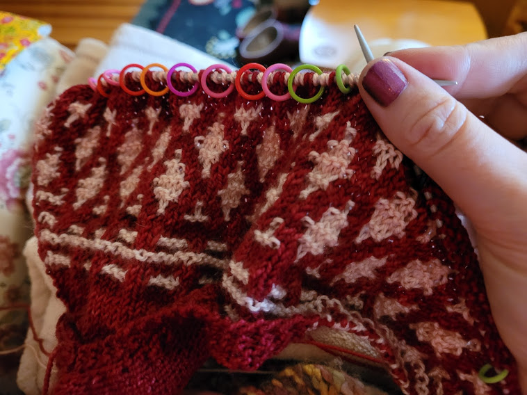 We’ve also been gifted with yarn, and gift cards to purchase yarn, which has brought abundant color into our household and enabled me to embark on some projects to learn “slip stitch” or “mosaic stitch” knitting — a technique for knitting two-color patterns. I’m working on a shawl currently with a red background and a pink-to-charcoal gradient that I’m super excited about (progress photo below). It’s my project for chemotherapy days, which are long and boring. It’s nice to keep my hands and mind busy while I’m being infused.