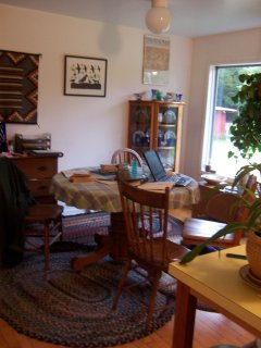 Returning stateside in July, I was unexpectedly handed a nine-month house-sitting gig when family friends going on sabbatical rang up to ask if I would be interested in staying in their home, rent free, for the academic year. It was my final year of college, where I was completing the last requirements to graduate after a prolonged seven-year stay. I spent the autumn, winter, and spring commuting twelve miles to campus from a rural holding situated next to a county park and across from a llama farm. The three family cats, half feral, came and went largely at will — though in the depths of winter they particularly enjoyed sleeping under the woodstove. Every Friday night I had my college roommate (“The College Apartment”) over for dinner and to stay the night before she left early for a Saturday morning shift at a yarn shop in the nearby village. This was the living room where I wrote my senior thesis on masculinity and pacifism during the Civil War, and where I celebrated the end of an academic era.