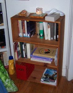 Hanna and I once again find ourselves running out of space for books (the everlasting logistical challenge of cohabiting bibliophiliacs — and neither of us have the bulk of our libraries here in Boston yet!) and managed to forestall the inevitable by purchasing a little wooden bookcase at the Goodwill.