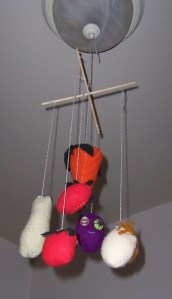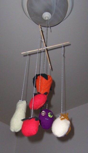 My mother also sent us a set of knitted vegetables made from recycled clothing, which Hanna and I improvised into a hanging mobile for the dining room, made from a set of chopsticks and box string left over from mike’s pastry boxes. Hanna says if hunters have the heads of their kill hanging in trophy rooms, it makes a certain amount of sense for vegetarians to have the heads of dead vegetables instead.