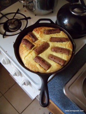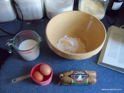 Hanna’s parents gave us Rose Elliot’s New Complete Vegetarian for Christmas and we’ve made some lovely and simple recipes from it, like the oatcakes and most recently vegetarian toad-in-a-hole. Toad-in-a-Hole is basically a baked pancake with sausage in, and very simple to make! Elliot’s version is as follows: