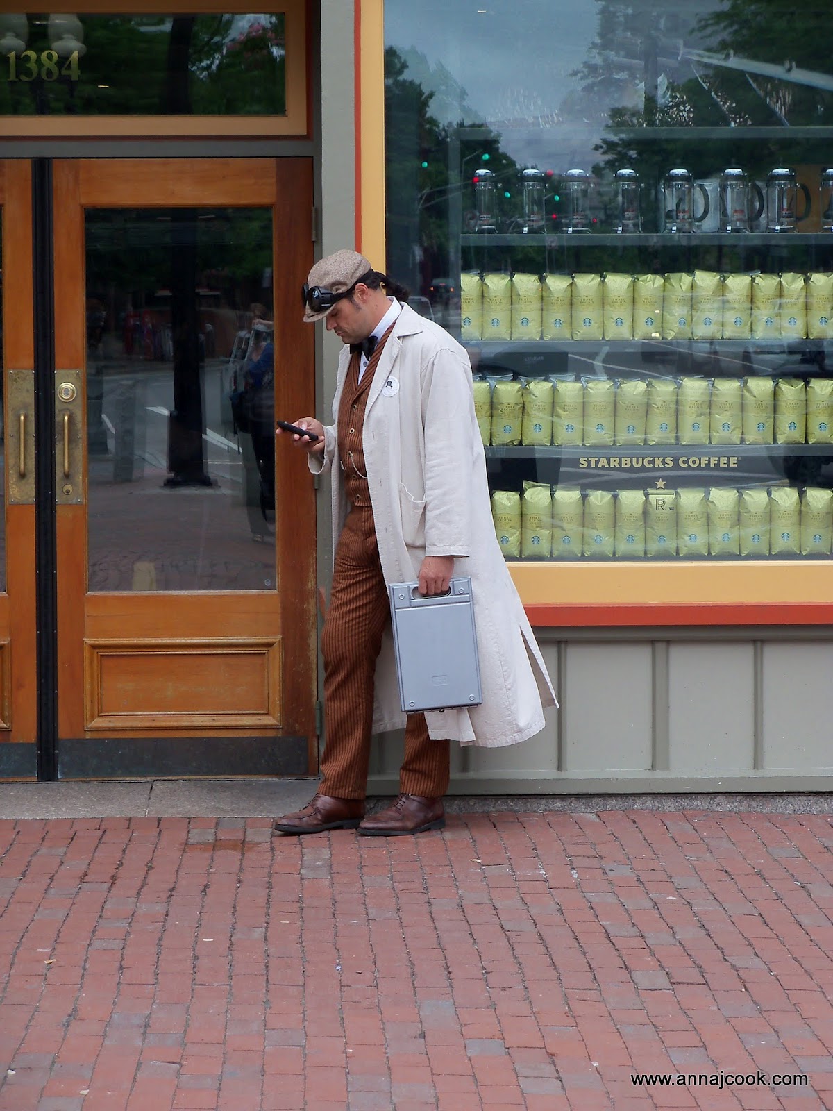 … And my favorite sighting of the day goes to this man from Cambridge Historical Tours, who was waiting for a tour group at the Harvard Square T stop and checking his smartphone. He was totally rocking the coat, hat, and goggles.