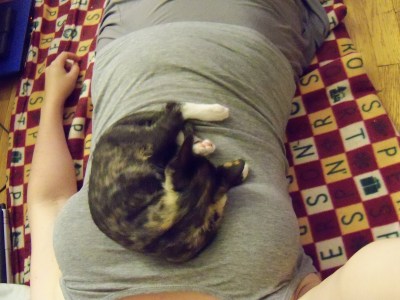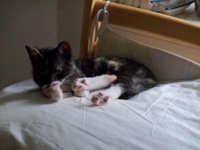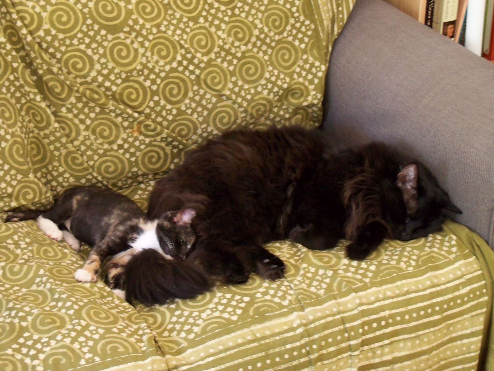 So we went back to sleeping at respectful distance — at least from each other; as you can see Teazle likes being right near the humans. (Last night, this was me and the kitten. Although I was on my back and the kitten was draped very warm-and-fuzzily across my collarbone.)