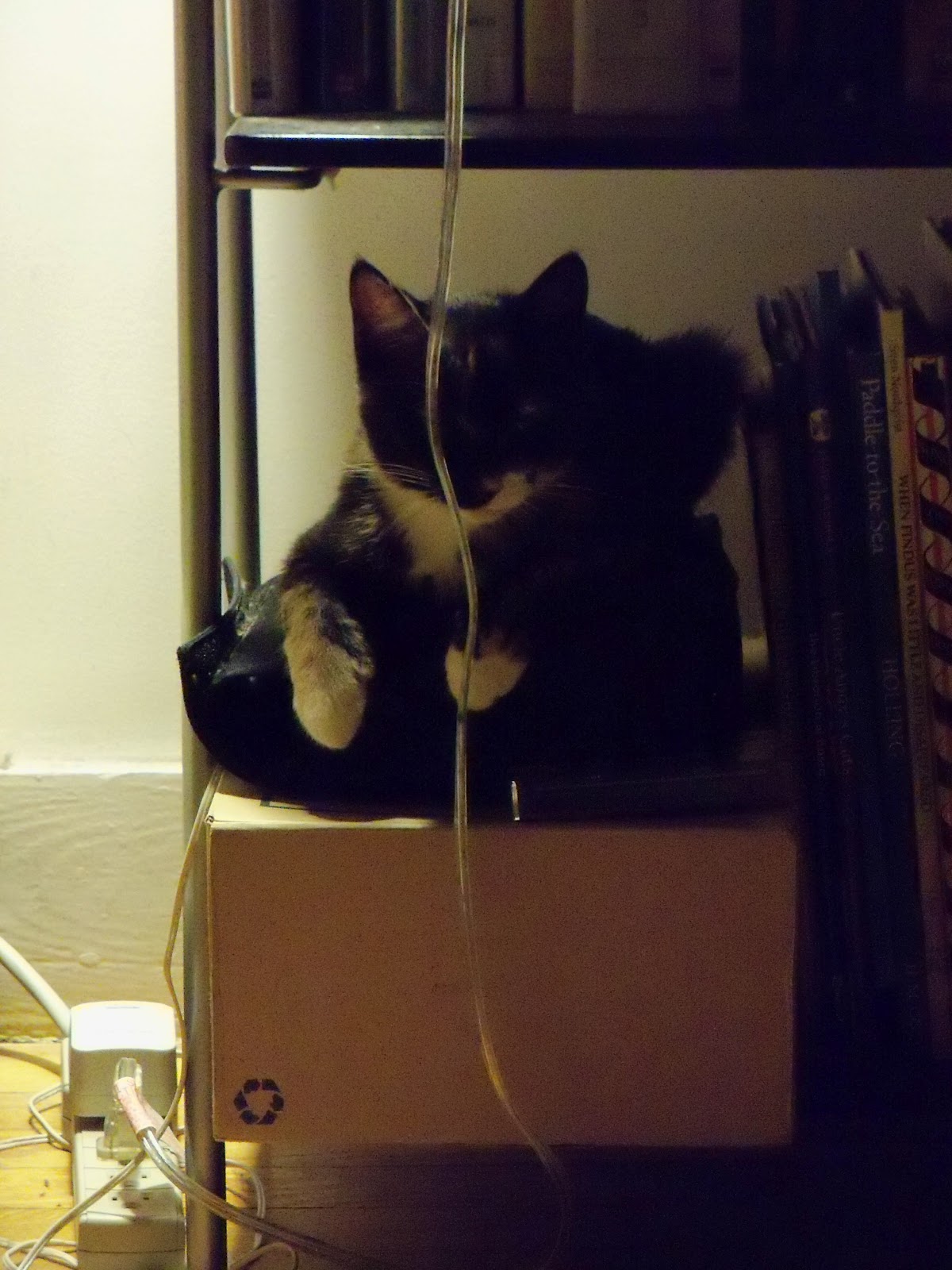 When we were moving everything around to deal with the bed bug scare, Teazle found an out-of-the-way spot on a bookcase in the bedroom to settle in for the evening.