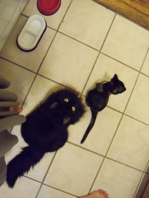 This was what their coexistence looked like as of twenty-four hours ago. They’ve been dancing in closer and closer circles ever since. When we got home from lunch with a friend this afternoon, they were actually nose-to-nose for a brief moment, before Teazle decided Gerry’s tail was the ultimate toy and Gerry gave her a swat upside the head.