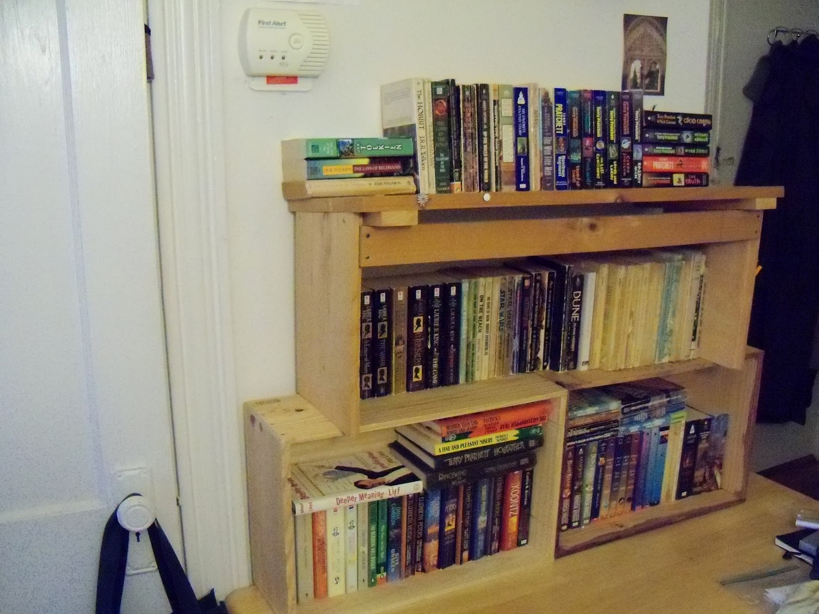 We recently had to mount a rescue mission to Maine to rescue about eight cardboard boxes of books Hanna had stored in an outbuilding on her parents’ land (an outbuilding which had started to leak). The boxes have been living under our kitchen table, but today we spent a few hours unpacking them. Above is the sort of ad hoc shelving you begin constructing when you live in a household with two bibliophiles who have access to all of the $1 used book carts of Boston.