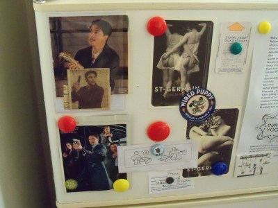 The other day, I happened to notice that the top left-hand corner of our fridge “art” is composed of pictures of Captain Jack Harkness (Torchwood), IKEA instructions, and two postcard ads for St. Germain beer I picked up at the local liquor store because they inexplicably featured vintage lesbian porn.