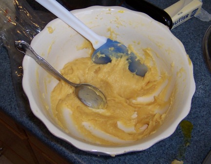 4) Remove pan from heat and add eggs, one at a time, mixing thoroughly after each egg.