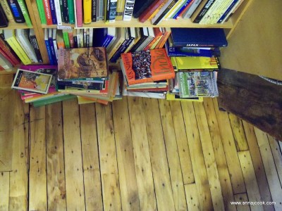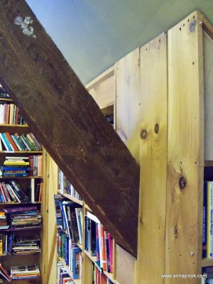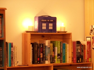 We moved the couch from the inside wall out to a spot beneath our bay windows (the element that really “makes” our living room as a space). This shift necessitated consolidation of some bookshelves into a book wall … bonus points if you spot the TARDIS shrine!