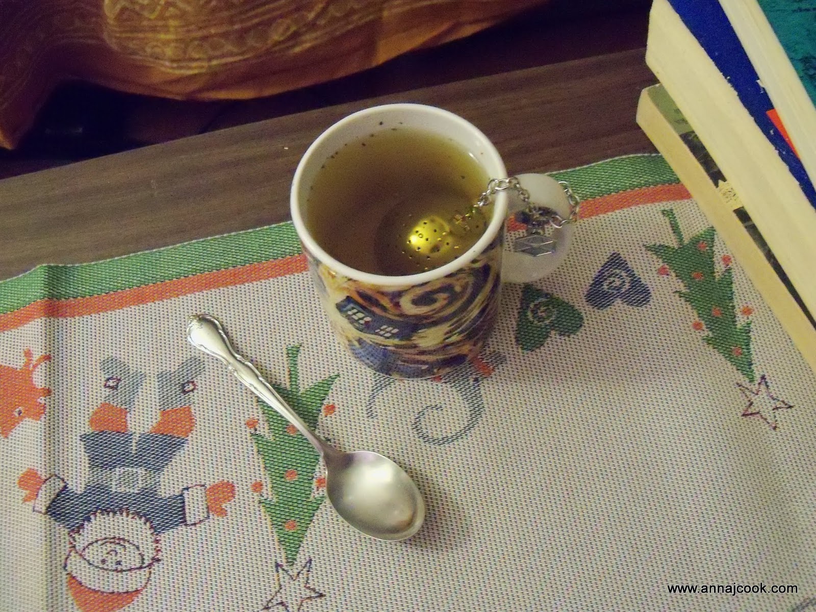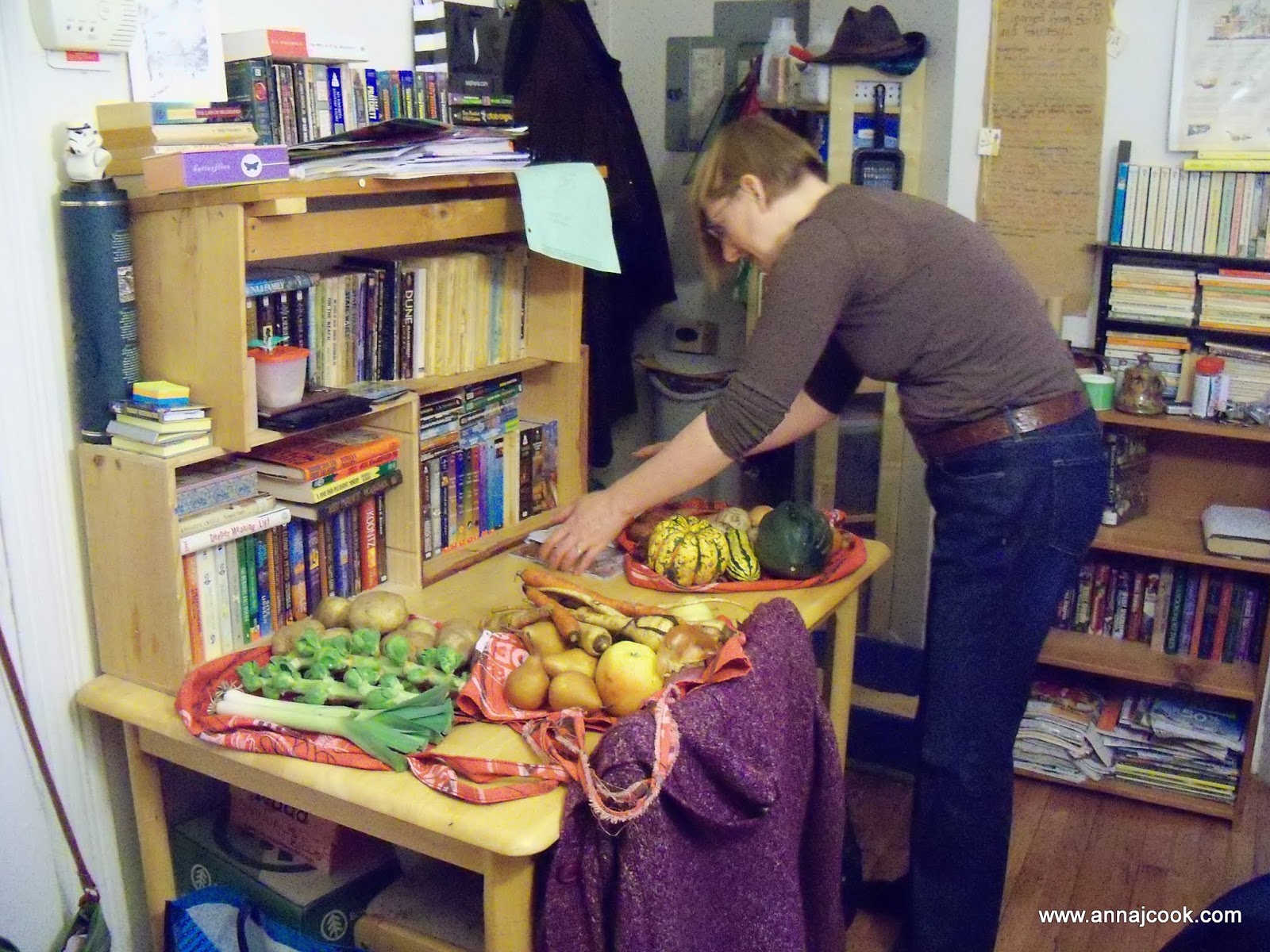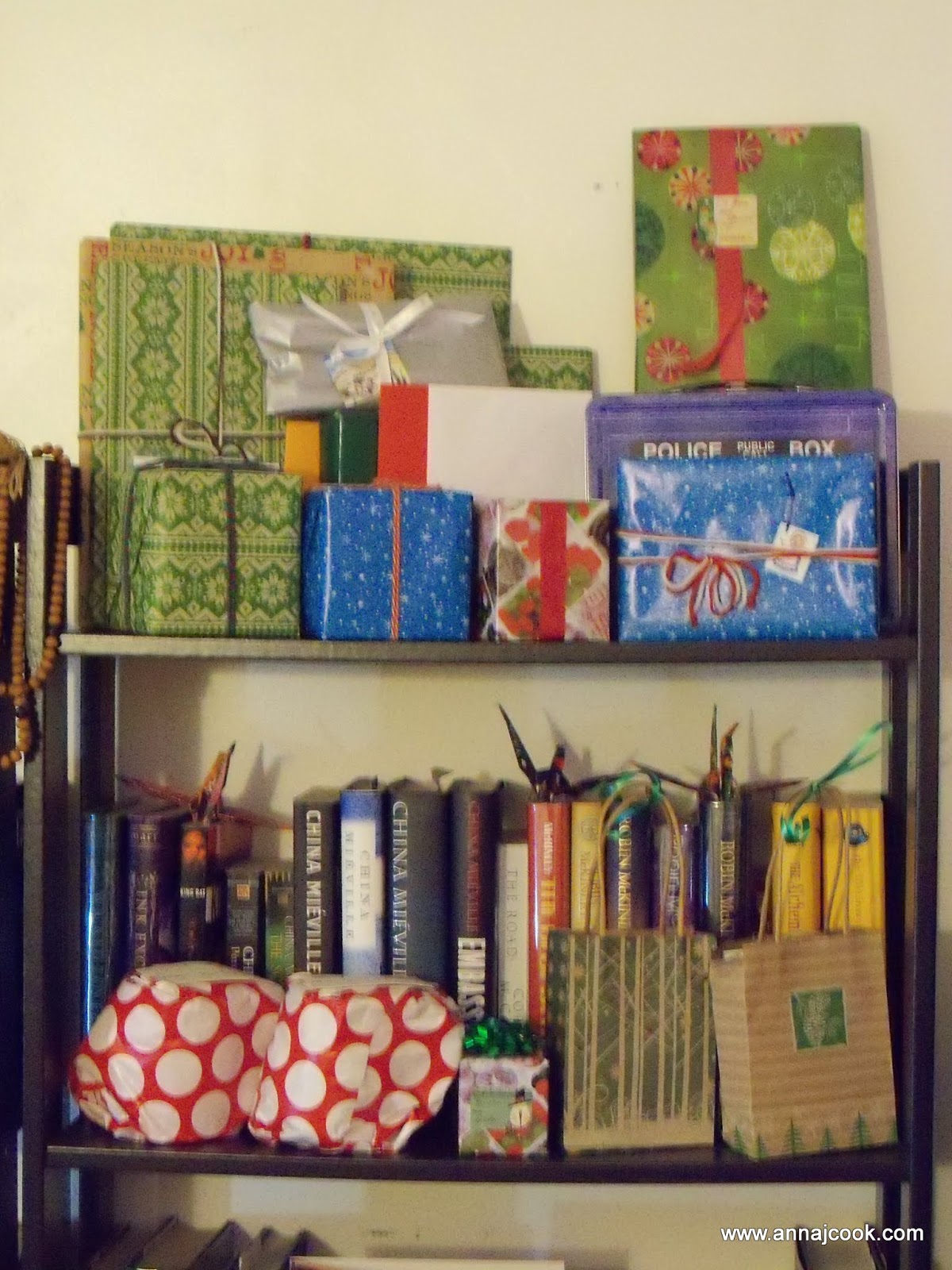 We moved the couch from the inside wall out to a spot beneath our bay windows (the element that really “makes” our living room as a space). This shift necessitated consolidation of some bookshelves into a book wall … bonus points if you spot the TARDIS shrine!