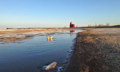 | Golden retrievers Addie & Josie swimming in Lake Michigan (photo by Mark Cook) |