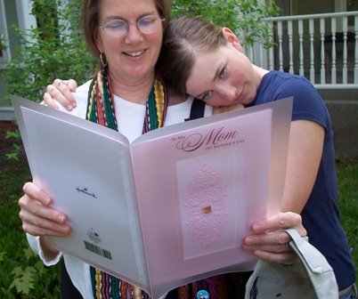 (Apologies to Mom and sister Maggie for re-using this tongue-in-cheek photograph; it was taken on Mother’s Day, 2005, incidentally the same day I graduated from Hope College. The card was a joke from Maggie to Mom. The scarf my mother is wearing is, in my opinion, one of her more lovely fashion accessories).