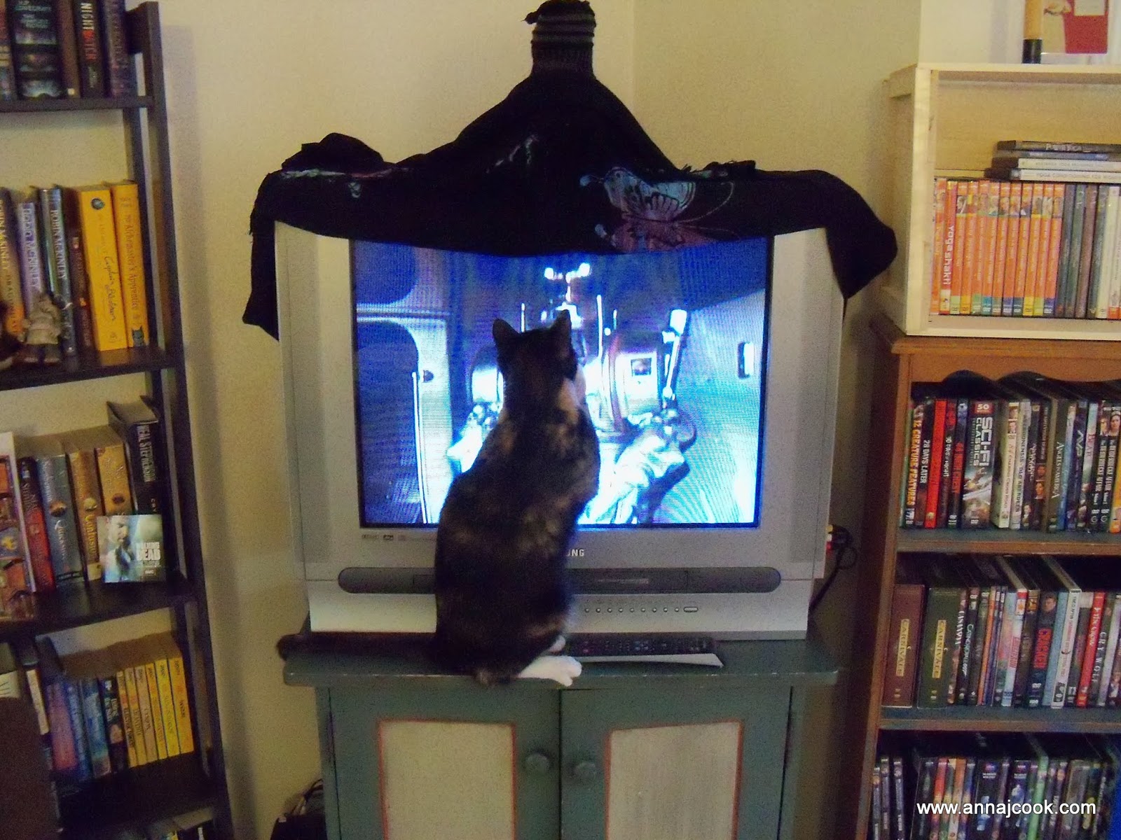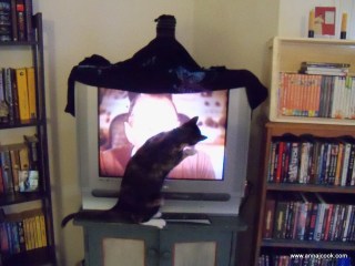 Our television set was inherited from friends and weighs a ton; for three years it’s been sitting precariously on a pine shelf scavenged from the junk heap. Left to its own devices, it’s safe enough but with a kitten scrambling about on top it was starting to sway noticeably. And after three successive scruffings and time-outs in the bathroom, after which Teazle simply returned to pick up where she’d left off, it was clear a solution was needed that would not result in our coming home after work one day to find a squashed cat, a shattered television screen, and a giant hole in the floor.