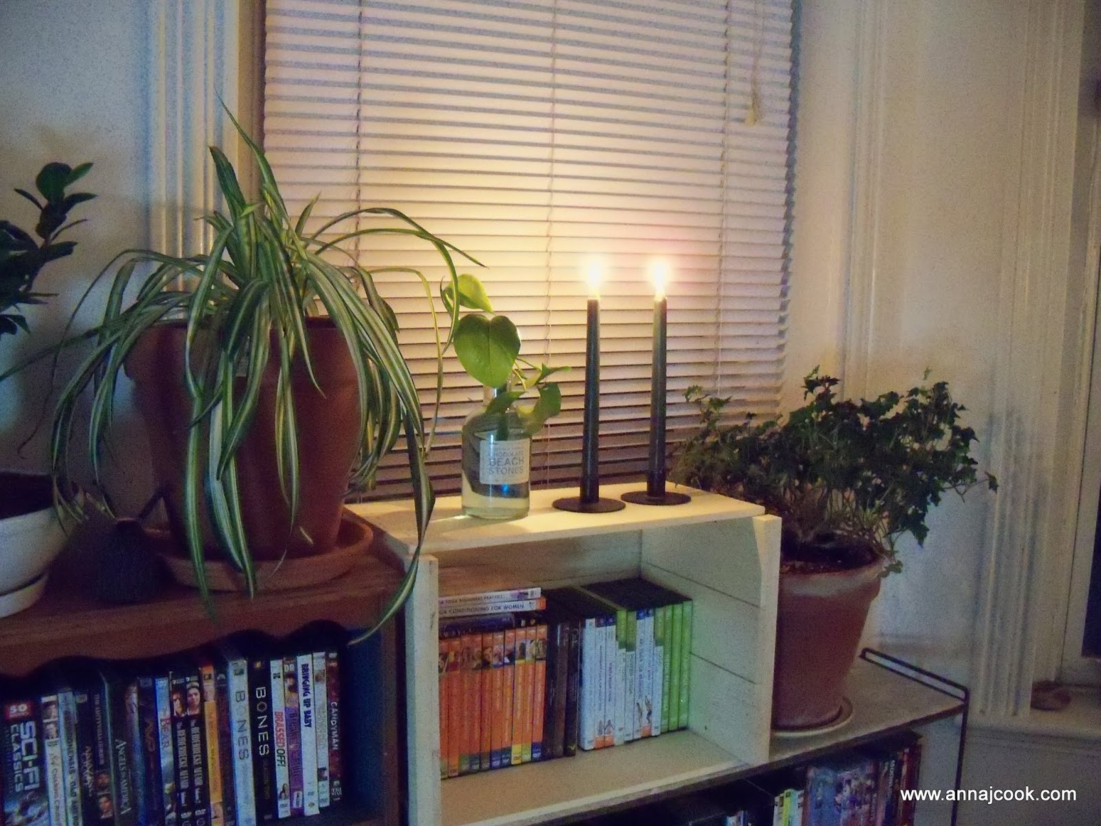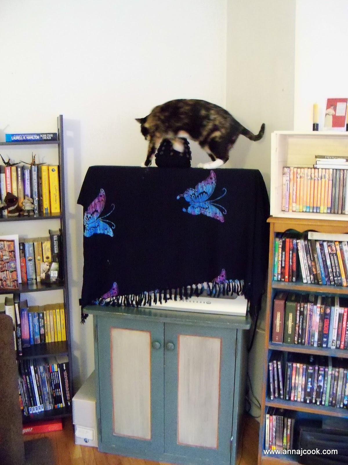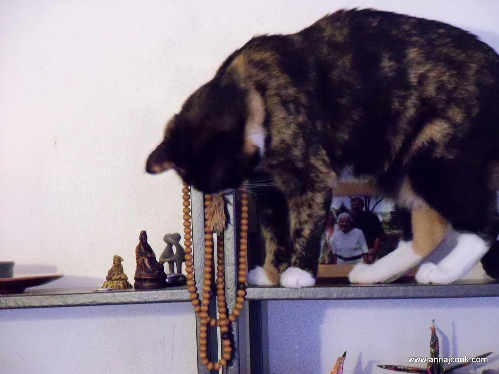 She’s determined to get across to Hanna’s home altar on the far left bookshelf …
