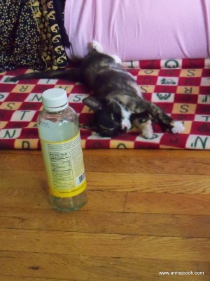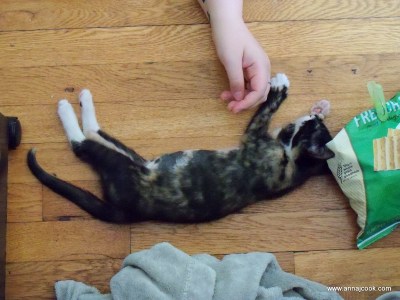This was what their coexistence looked like as of twenty-four hours ago. They’ve been dancing in closer and closer circles ever since. When we got home from lunch with a friend this afternoon, they were actually nose-to-nose for a brief moment, before Teazle decided Gerry’s tail was the ultimate toy and Gerry gave her a swat upside the head.